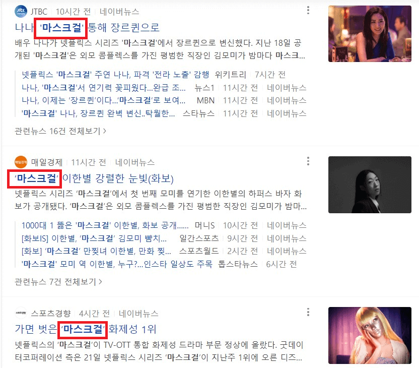 3명의 마스크걸 역할에 대한 넷플릭스의 스틸컷입니다. 이한별, 나나, 고현정 배우님의 열연으로 소문으로 뜬 드라마가 아니라 평도 좋다고 마무리 지을 거 같습니다. 신인배우이신 이한별 님의 연기도 다른 배우 못지않게 정말 잘하시는 것 같습니다.