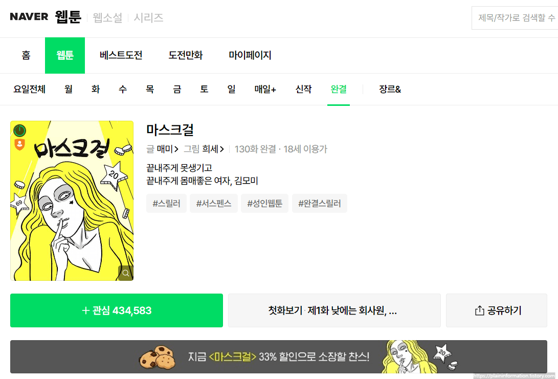 매미작사님이 작성하고, 희세작가님이 그림을 그린 네이버 웬툰이 원작입니다. 웹툰으로는 130회이고, 이 또한 18세 이용가입니다.