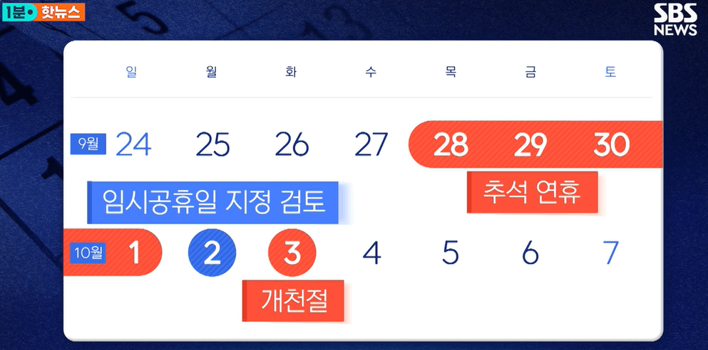대한민국 정부에서 2023년 추석 연휴인 9월 28일 ~ 10월 1일과 개천절인 10월 3일 사이에 끼어있는 10월 2일(월요일)을 임시공휴일로 지정을 검토하고 있습니다. 직장인인 저로써는 아주 반가운 소식인데요, 10월 4일 하루만 휴가를 쓰면 장장 7일 동안 쉴 수 있습니다.